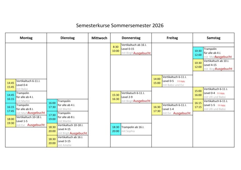 Ob Trampolin oder Vertikaltuch – sichere dir deinen wöchentlichen Fixkurs mit mindestens 15 Terminen. Starte im September bzw. Februar oder steige später ein, solange Plätze frei sind. Mit deiner festen Trainingsgruppe kann deine Lernkurve gezielt aufgebaut werden – und deine Trainer planen über mehrere Einheiten Übungen für dich.